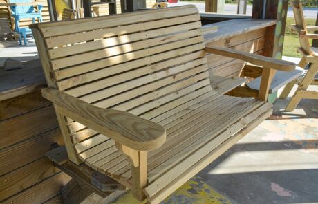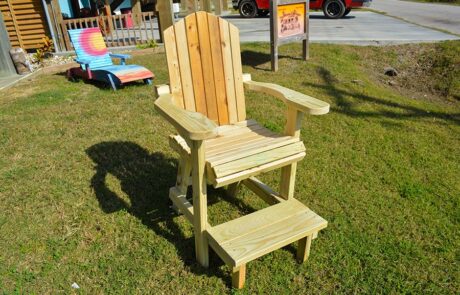 Custom Wood Patio and Deck Furniture including chairs high-back and low-back, swings, outdoor bars, shower enclosures, bar stools and more… All furniture comes standard with treated lumber, glued and screwed seat and back slats, galvanized hardware, custom cut and routed cup holder or wineglass holder built in-to your chair, and each is hand crafted to your request.