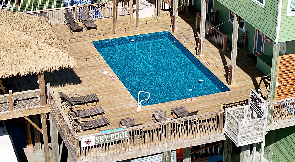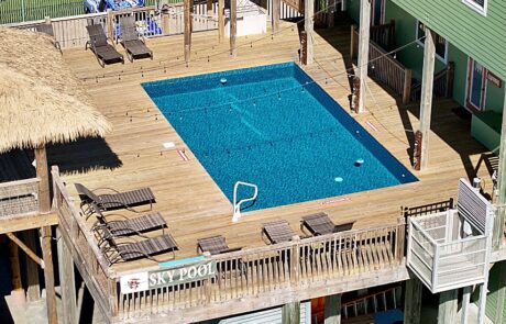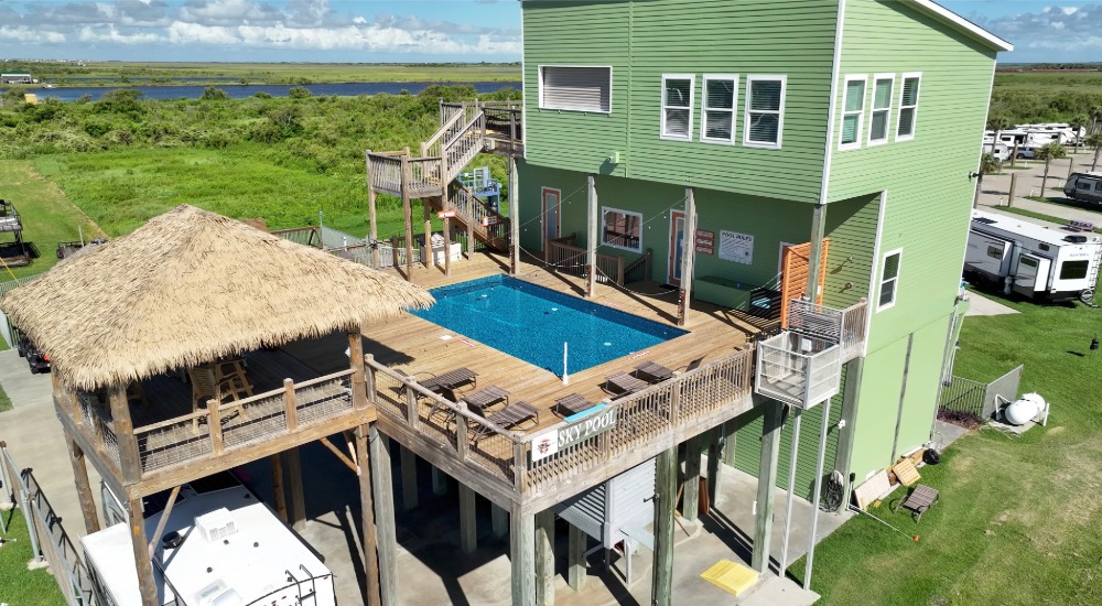 Our Texas Gulf Coast RV Park Clubhouse features an exclusive “Sky Pool” that is 26′ above sea level, providing you with amazing Gulf views. The pool is heated all winter long, and we also have an adult-only “Serenity Deck” that is 40′ above sea level. Our TV/Game Room is perfect for family entertainment, and we offer showers and laundry facilities for your convenience.