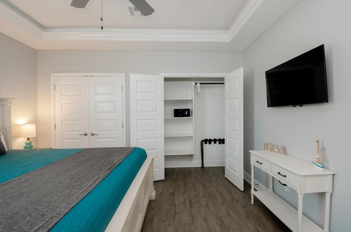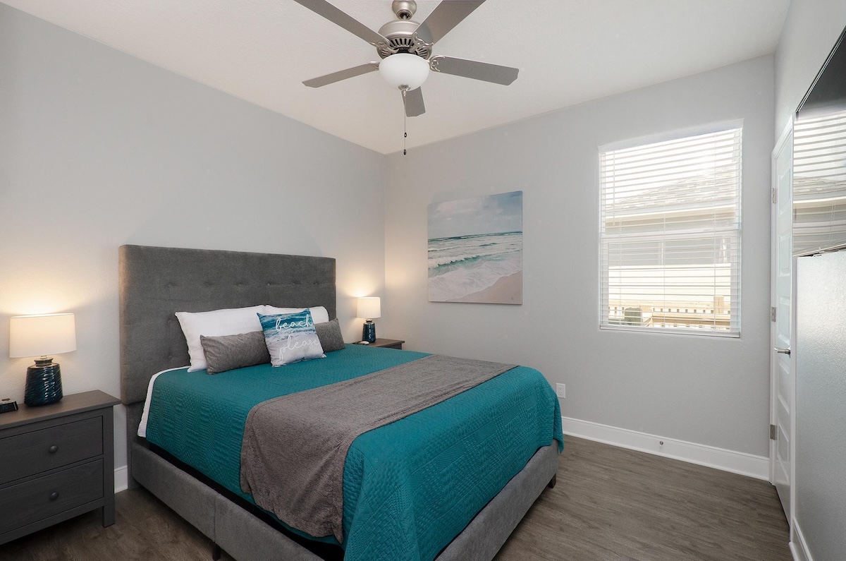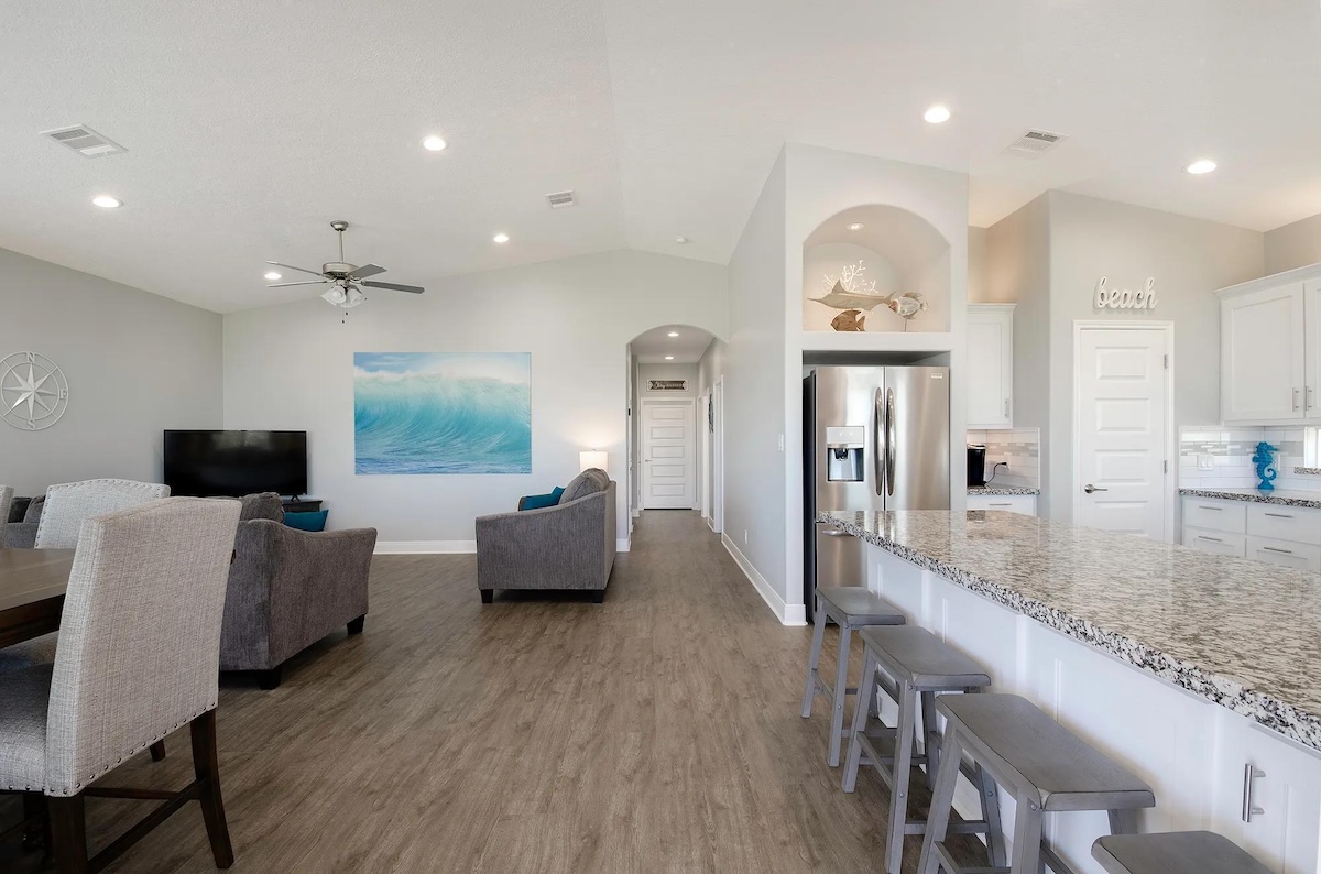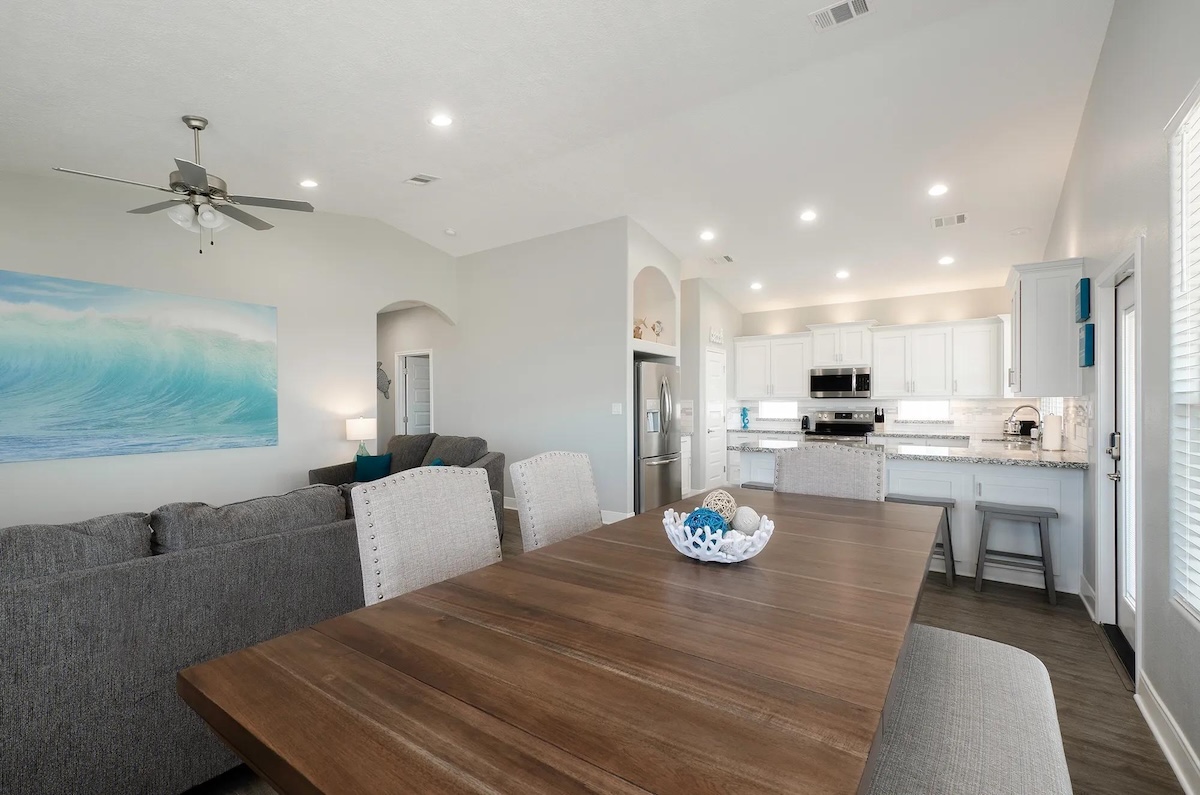 The fully equipped kitchen includes a versatile coffee maker compatible with both grounds and pods, ample counter space, and seating for everyone with a dining table and four bar stools. After a full day on the beach, unwind on the plush sofa and enjoy movie night on the 55-inch smart TV with DIRECTV. The home comfortably sleeps up to eight guests across three bedrooms, including a spacious primary suite with a private en-suite bath, large walk-in shower, dual closets, and a built-in safe. The second bedroom features a queen bed, while the third bedroom offers two twin-over-twin bunk beds, perfect for kids. Each bedroom includes a smart TV and luggage racks for added convenience.