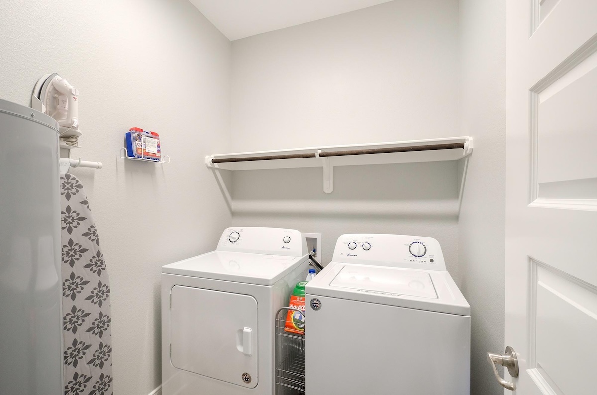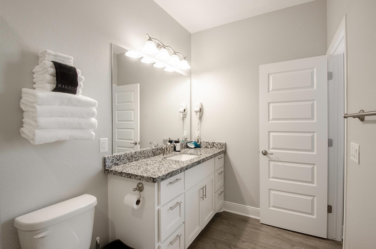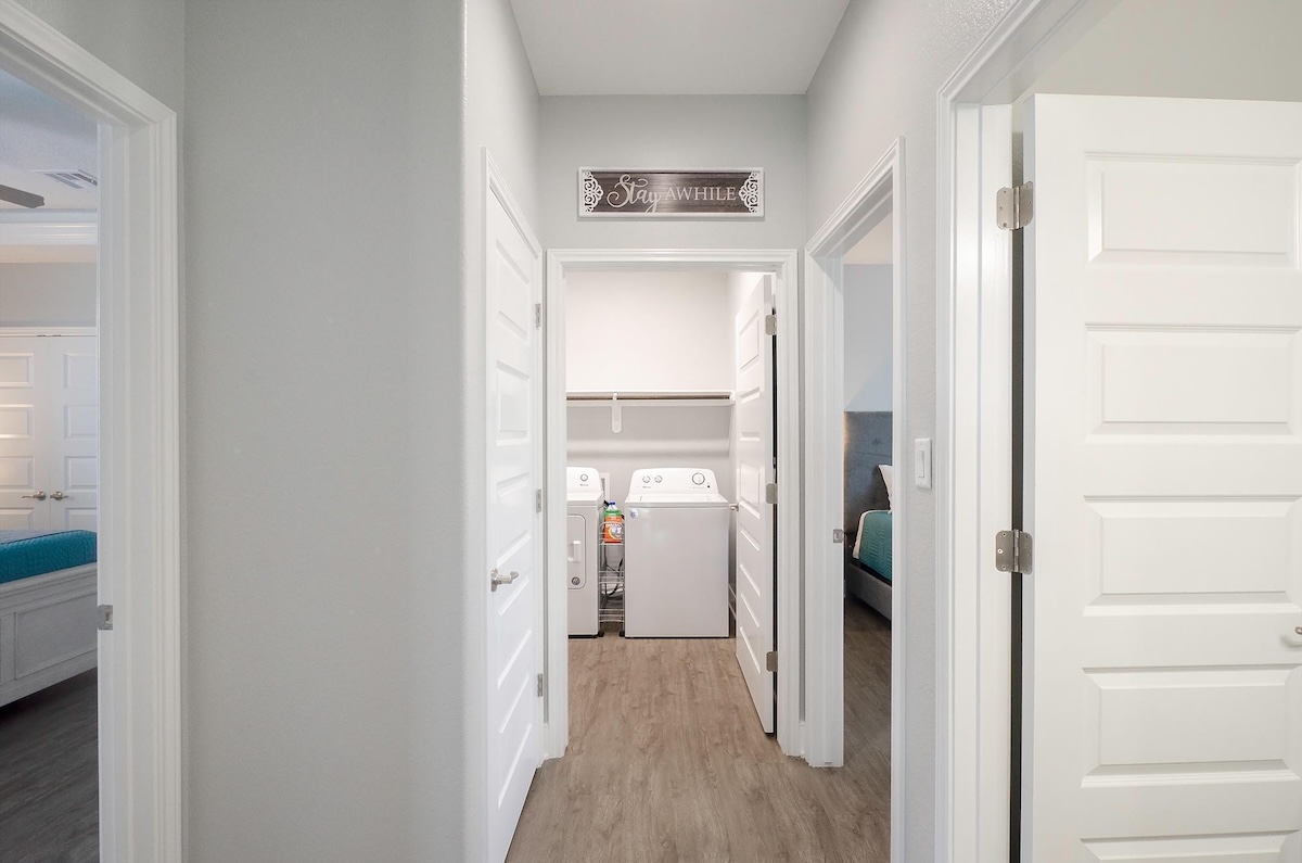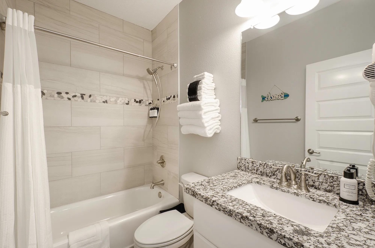 The fully equipped kitchen includes a versatile coffee maker compatible with both grounds and pods, ample counter space, and seating for everyone with a dining table and four bar stools. After a full day on the beach, unwind on the plush sofa and enjoy movie night on the 55-inch smart TV with DIRECTV. The home comfortably sleeps up to eight guests across three bedrooms, including a spacious primary suite with a private en-suite bath, large walk-in shower, dual closets, and a built-in safe. The second bedroom features a queen bed, while the third bedroom offers two twin-over-twin bunk beds, perfect for kids. Each bedroom includes a smart TV and luggage racks for added convenience.